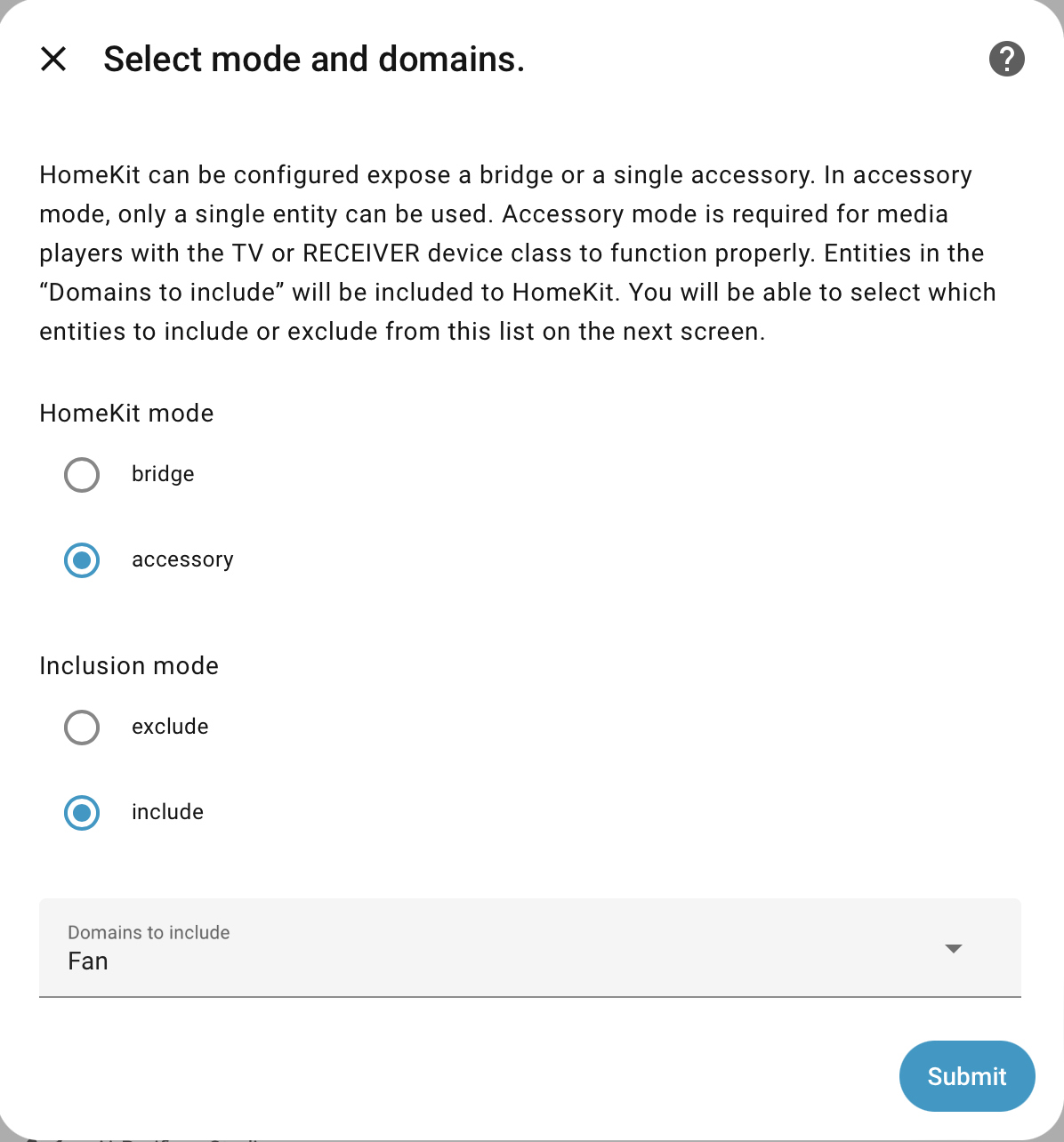 Instead I could envision an option similar to HomeKit valve support, which gives you the option to declare a switch as a valve type when bridging to HomeKit in accessory mode. Similarly, it would make sense to have the option to bridge a fan to HomeKit as an air purifier, for example something like this: