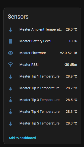 I didn’t however, experience the Meater powering off/disconnecting after an hour. Mine will seemingly keep transmitting until the battery dies. It transmitted for 18 hours overnight, though there were two ~1hr interruptions after ~7hrs and ~12hrs in. Not sure if that’s the device or my ESPHome device disconnecting.