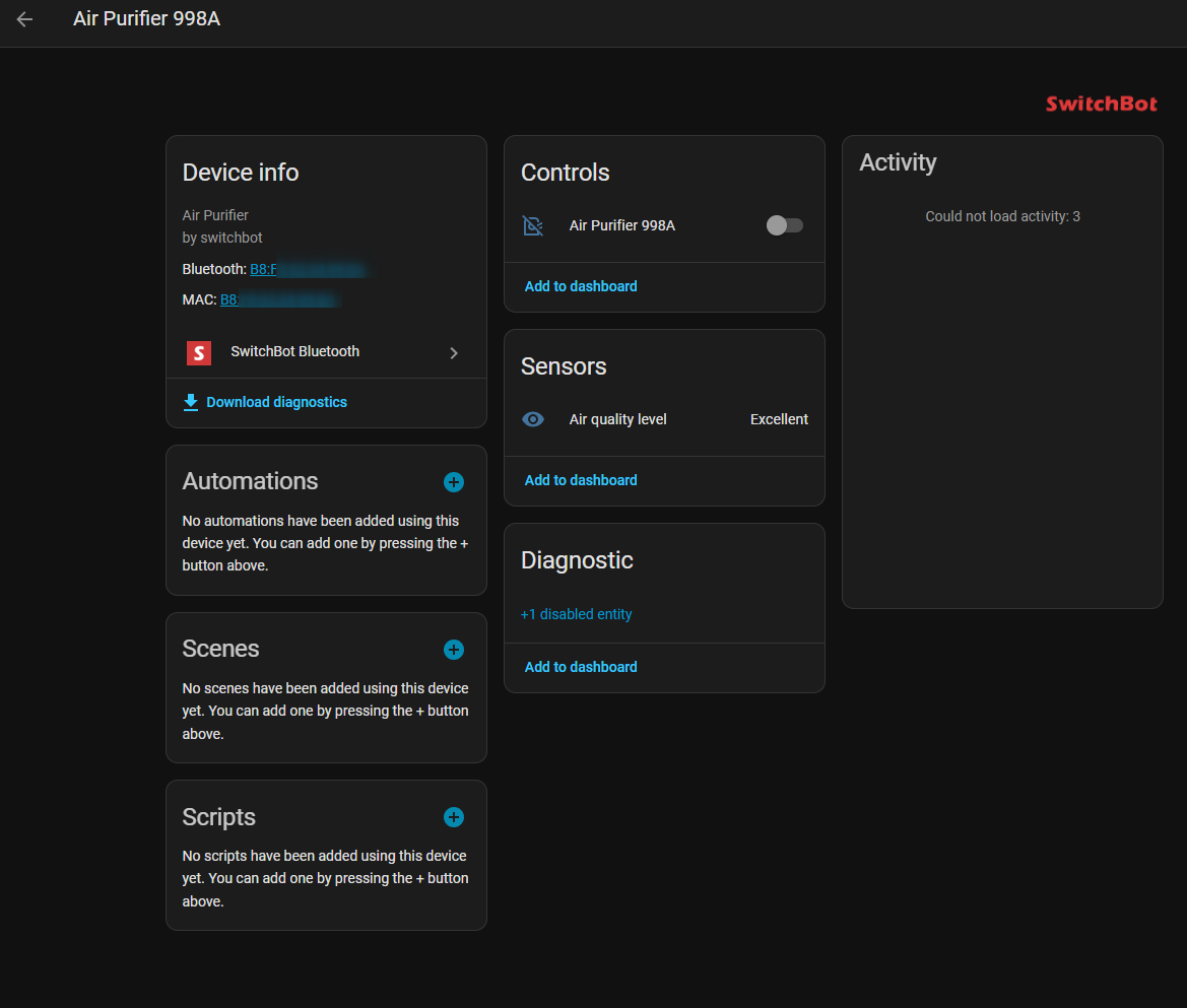 ) and no extra hub or bridge. The air purifier is connected via SwitchBot Bluetooth integration only: