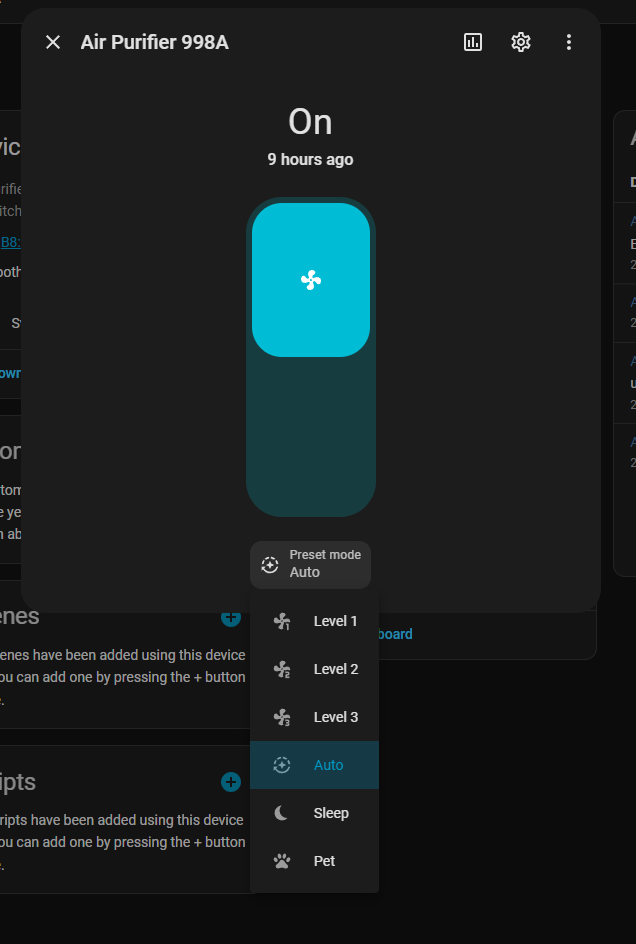 I have both, and I’m not able to see them in Home Assistant, nor control the mode, fan speed, light, or other attributes. I can’t get their detected PM2.5 levels either. It would be cool if these were supported, please. My third air purifier (Levoit 400S) is perfectly supported by HA.