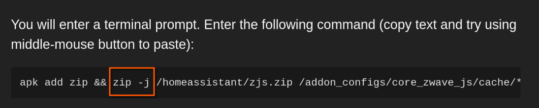 zipā program to create the archive-jā ājunk pathsā (donāt store folder structure, just the file names)/homeassistant/zjs.zipā output file/addon_configs/core_zwave_js/cache/*.jsonlā input files to include