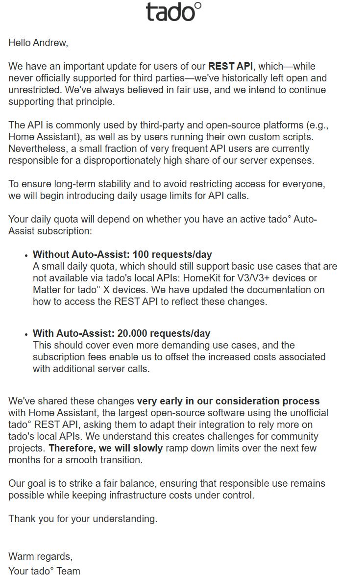 I too, just got the email about rate limiting. Everything except my hot water control is exposed through homekit, but what happens when you do that, but you still have schedules running on the tado server ? I assume they would just overtake the setting applied locally via homekit ?
