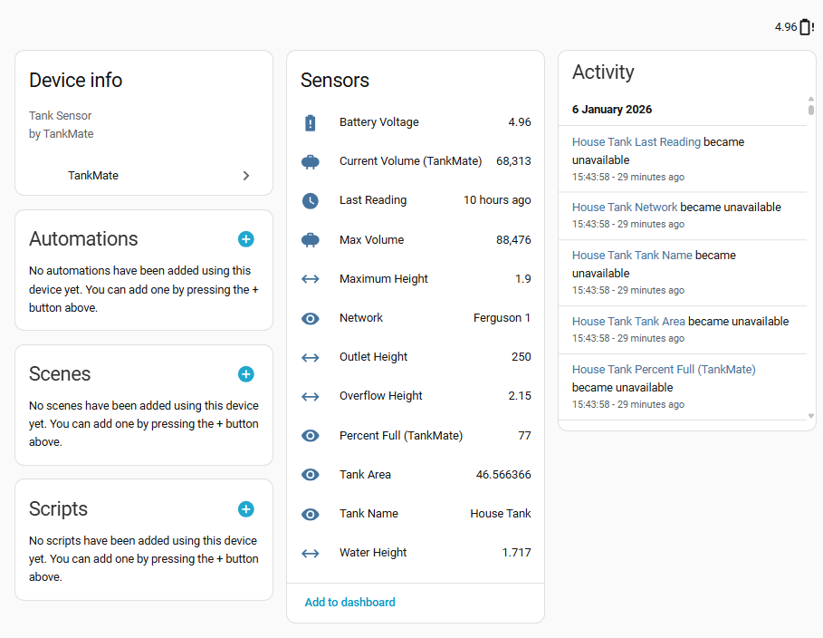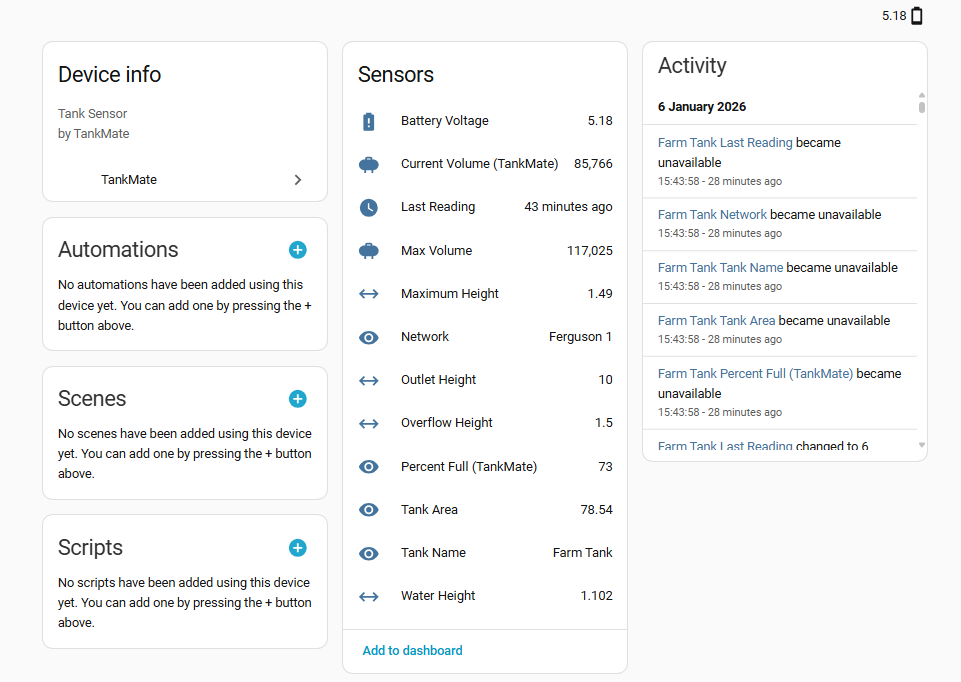 I’ve “recalibrated” the sensor by tweaking the tank dimensions in the app, so the reported parameters are now more realistic. Also I think a scan_interval of 2000 or longer is better given the sensor only sends updates to TankMate twice a day. The app also displays the battery % but the YAML code doesn’t calculate this. Not sure how to add this - perhaps some local calculation/formula is required?