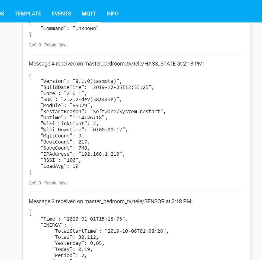 {“Version”:“8.1.0(tasmota)”,“BuildDateTime”:“2019-12-25T12:33:25”,“Core”:“2_6_1”,“SDK”:“2.2.2-dev(38a443e)”,“Module”:“Sonoff Basic”,“RestartReason”:“Software/System restart”,“Uptime”:“1T00:39:10”,“WiFi LinkCount”:1,“WiFi Downtime”:“0T00:00:12”,“MqttCount”:1,“BootCount”:22,“SaveCount”:87,“IPAddress”:“10.0.0.163”,“RSSI”:“52”,“LoadAvg”:19}