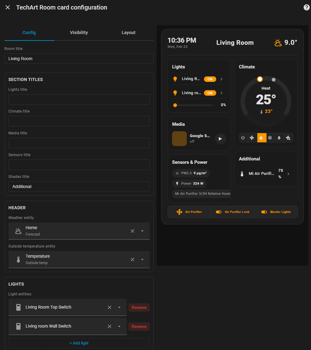 A Lovelace room dashboard card with a native Home Assistant look, visual editor support, and dynamic sections.
