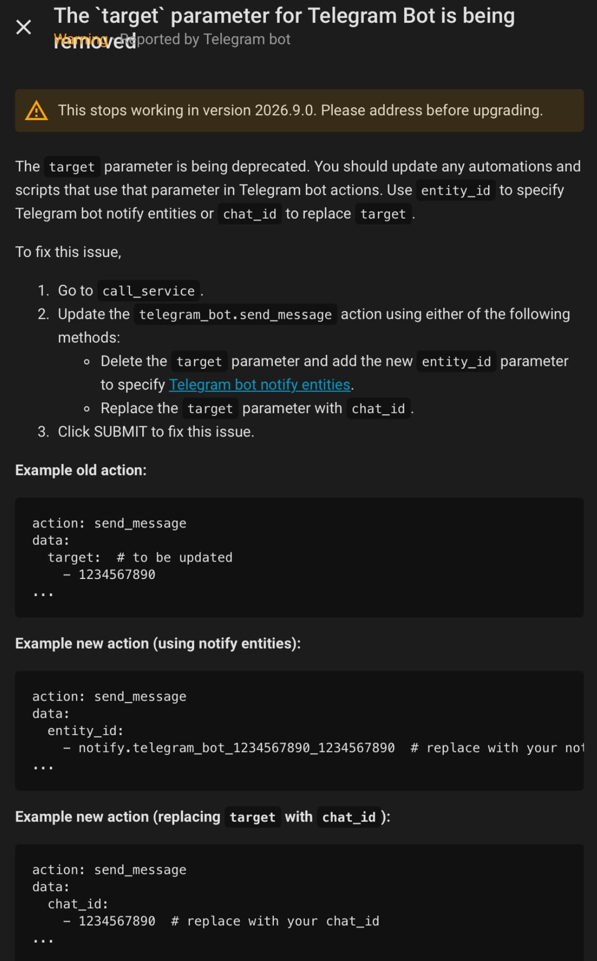 I’m getting the error message in HA about Telegram Bot and the Target parameter will be removed, see screenshot. I’m searching in my automations and in my configuration file, but I cannot see the Target parameter being used in combination with Telegram. Why do I get this error message? Suggestion on how to debug this