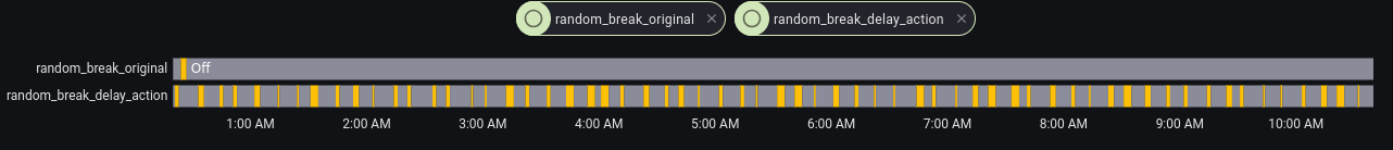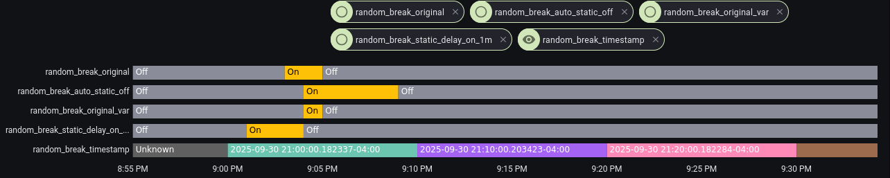 I think you probably hit on something fairly esoteric. You’re using delay_on and auto_off correctly in a static sense, seemingly. But I am not sure that the definition of these parameters is consistent with your expectation given the constant on for the state. This could explain why a change to the implementation resulted in a change to the behavior you’re seeing