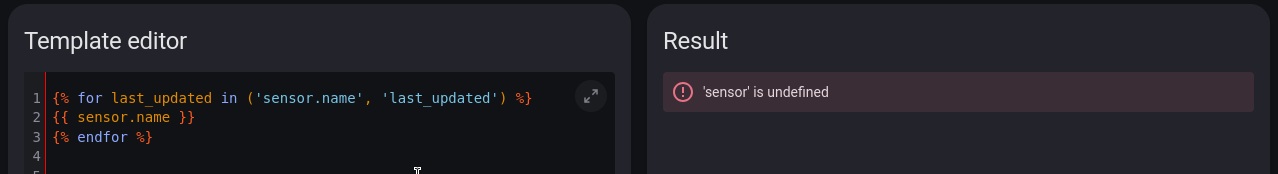 - You created a loop that will run twice… once for the string ‘sensor.name’ and again for the string ‘last_updated’. While the loop is running, the variable