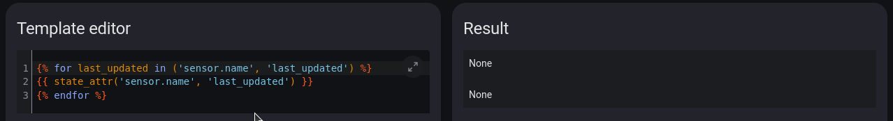 3b. Unless you actually have an entity in your Home Assistant instance with the entity ID “sensor.name”, the second part will always render none. Also last_updated and last_changed are properties of the state object, not state attributes, so they are not accessible with the function state_attr().