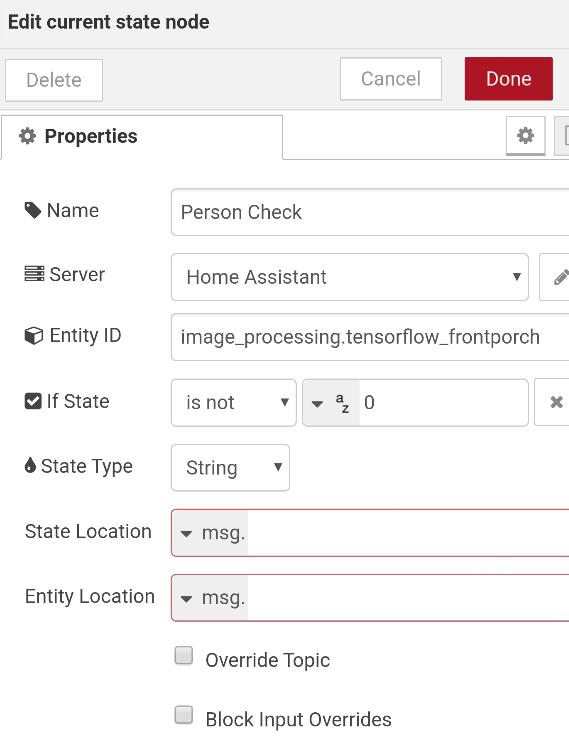 After triggering the TensorFlow scan use a current state node to pull in the results - here I have it check if the person detection is greater than 0 (I have it setup only to check for person - nothing else - so anything over 0 is a person).