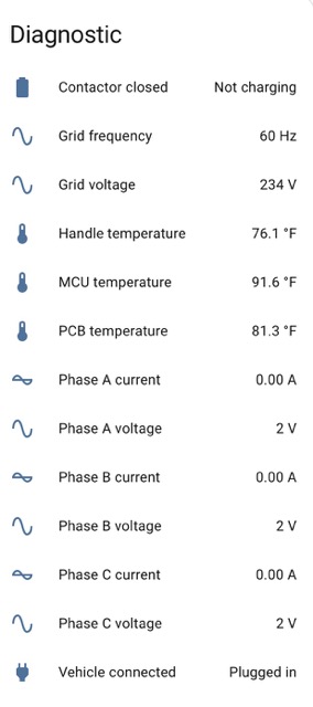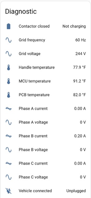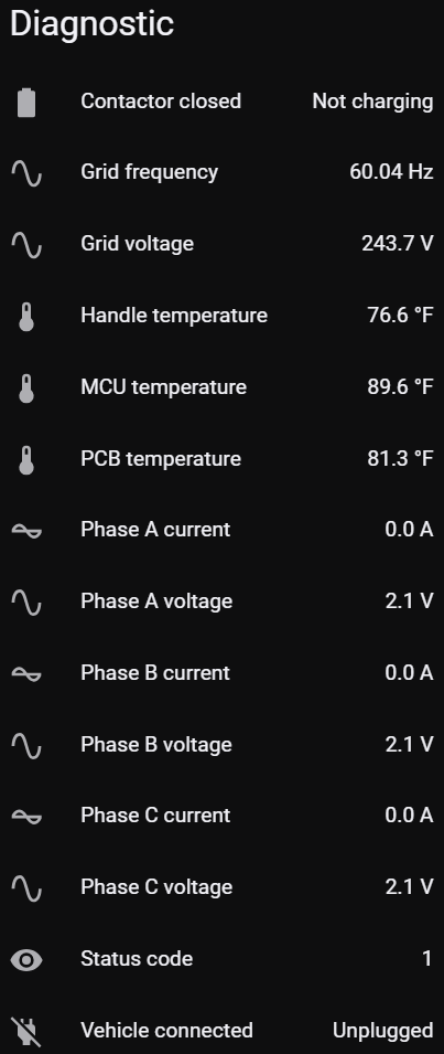 Edit: Another interesting difference about the Tesla UWC is that the current draw reads differently than on the regular Gen 3 wall connector. On the regular WC, for whatever reason, it shows active current distributed between Phase A and Phase B (shouldn’t that read Side A and Side B in the integration, at least in the US where we’re 240v single-phase?). On the UWC, all current draw is shown on Phase B.