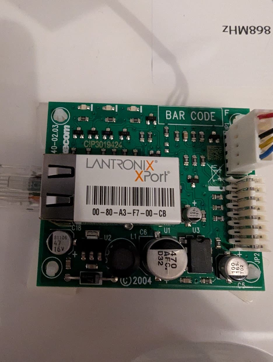 (That is me holding the ComIP up as I had to workout where to stick it on the panel lid so that it would all fit. The ComPort+ is the tiny (and VERY expensive board plugged into the grey ribbon cable that plugs into the top of the board). That the plugs into the board I’m holding which then plugs into the Ethernet. ComIP looks like this: