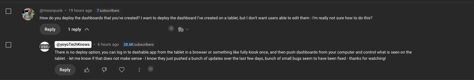 You don’t really deploy a dashboard, just log into Dashable.aop on your tablet, computer etc once, and then you can control whats displayed on that device from any computer/device logged into Dashable remotely - I am using Fully Kiosk on my tablets as well, but you don’t need too. I edit all my dashboards on my main computer and they just update automatically!