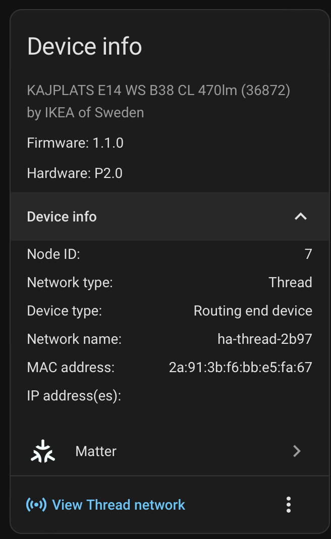 Last week I commissioned six Ikea KAJPLATS lightbulbs successfully; get hass_otbr up and running, set up IV6, etc. all fine. Today, they’re all showing as unavailable in HA, even though they are still connected to the border router. In HA, the Device Info panel for the matter devices is showing correct MAC address and network name, but wrong Node IDs (old ones, I suspect) and no IP addresses.