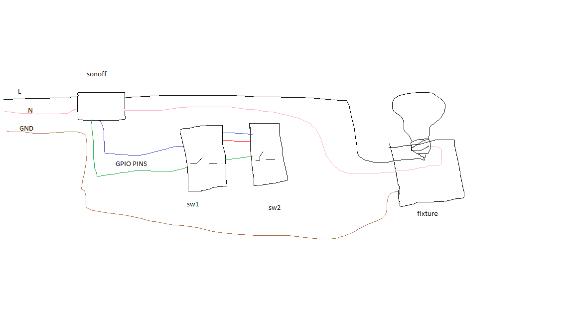 So let’s say I want to convert this to a smart switch. Can I install something like a Sonoff Touch with into the switch location fed by mains and then use the traveller wire and the AC ground to use a GPIO pin and the AC ground to connect a switch in the second location (with the L and N wires in the second switch box just connected to bypass the switch entirely)?