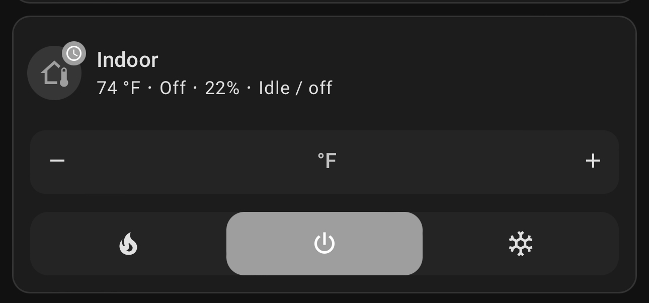 I have exactly the same setup (hybrid gas furnace/electric heat pump in house and electric heat pump minisplit in the garage) and also have the badge affixed to the icon only for the house. I wish there were a way to turn off the badge or at least make it consistent for both climate entities. I don’t think the solved answer is correct because as the OP screenshot shows, the furnace is running and the badge shows the grayed-out clock (not the flame, as was suggested).
