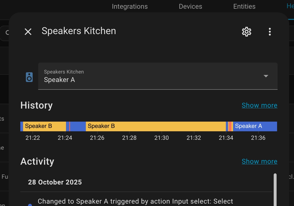 I’ve got it working with a Helper and an automation sat behind it monitoring the “Speakers Kitchen” drop down. So that’s fantastic thank you. Means we’re not scrambling for the remote every time we want to switch the speakers.
