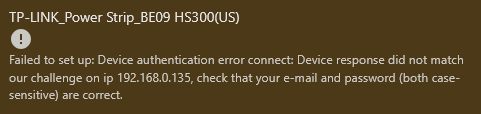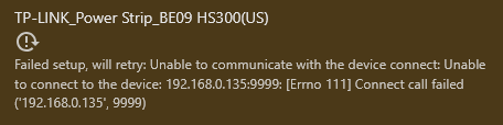 I have 27 various TP-LINK smart plugs and switches happily connecting to my Home Assistant for a very long time. I just now upgraded from 11.1 to 11.2 and now my HS300 power strip is not connecting.