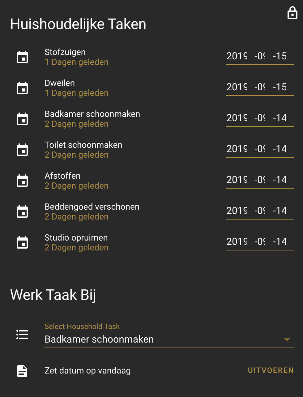 I want to be able to keep track in Home Assistant when a household task was last done, how many days ago and with a simple click I can change the date to today.This works with the main tasks that come back once a week or 2 weeks etc.