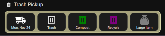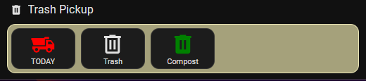I am using the hacs_waste_collection_schedule integration to get my city’s (Denver, CO) trash pickup schedule. The bins change each week and the weekly regulars can be skipped sometimes. I put together this display element using button-cards and button-card templates from Fun with custom:button-card by @ktownsend-personal.
