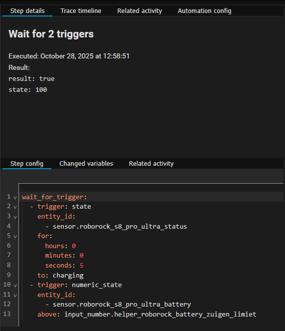 I created an automation to start my robot vacuum when it has the state “Charging” for 5 min and the battery is more than 60% (which is stored in an input number helper).