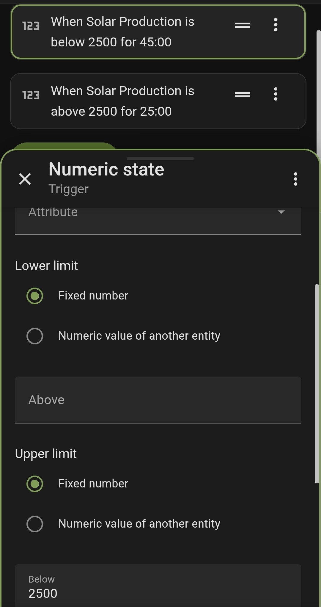 I’m trying to create an automation that is triggered by my solar production being above or below a certain output for x amount of time. Unfortunately it can only be triggered by the output being above the lower limit or below the upper limit. I want it to go by the value of the upper limit only (or the mean, but I can’t even call that value). I feel like I’m missing something.