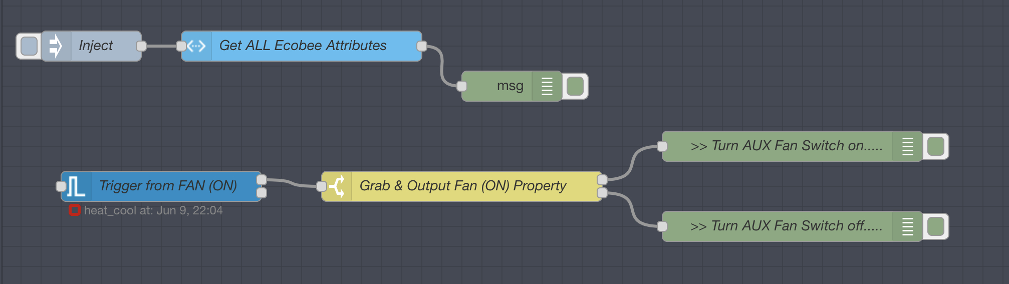 [{"id":"66093b3b.9510f4","type":"switch","z":"708e6065.155a58","name":"Grab & Output Fan (ON) Property","property":"data.attributes.fan","propertyType":"msg","rules":[{"t":"eq","v":"on","vt":"str"},{"t":"else"}],"checkall":"true","repair":false,"outputs":2,"x":480,"y":300,"wires":[["f0e498b1.8a9aa"],["9abb5a94.d98f4"]]},{"id":"55a5a3a9.4c1acc","type":"poll-state","z":"708e6065.155a58","name":"Poll Ecobee Thermostat (60s)","server":"41c2e4cc.1954cc","version":1,"exposeToHomeAssistant":false,"haConfig":[{"property":"name","value":""},{"property":"icon","value":""}],"updateinterval":"60","updateIntervalUnits":"seconds","outputinitially":true,"outputonchanged":true,"entity_id":"climate.home","state_type":"str","halt_if":"","halt_if_type":"str","halt_if_compare":"is","outputs":1,"x":180,"y":300,"wires":[["66093b3b.9510f4"]]},{"id":"f0e498b1.8a9aa","type":"change","z":"708e6065.155a58","name":"Msg.payload >> on","rules":[{"t":"set","p":"payload","pt":"msg","to":"on","tot":"str"}],"action":"","property":"","from":"","to":"","reg":false,"x":730,"y":260,"wires":[[]]},{"id":"9abb5a94.d98f4","type":"change","z":"708e6065.155a58","name":"Msg.payload >> off","rules":[{"t":"set","p":"payload","pt":"msg","to":"off","tot":"str"}],"action":"","property":"","from":"","to":"","reg":false,"x":730,"y":340,"wires":[[]]},{"id":"41c2e4cc.1954cc","type":"server","z":"","name":"Home Assistant","legacy":false,"addon":true,"rejectUnauthorizedCerts":true,"ha_boolean":"y|yes|true|on|home|open","connectionDelay":true,"cacheJson":true}]