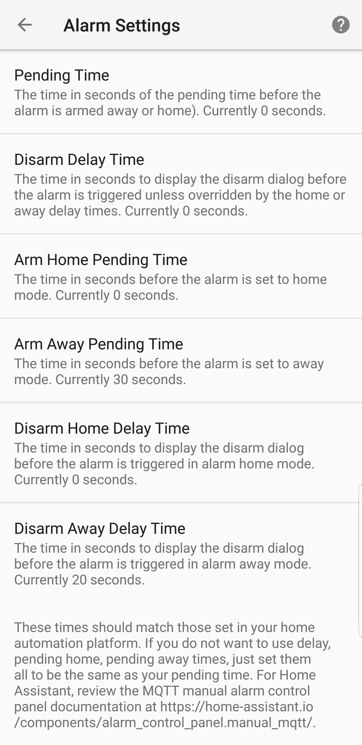 I’m using the Manual Alarm Control Panel with the MQTT Alarm Control Panel app on my Android