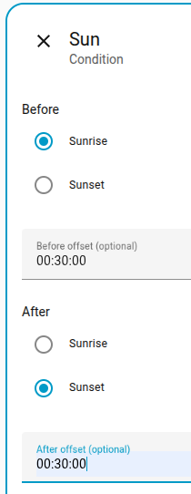 I want the automation to turn the light on (enable) before sunrise,… and after Sunset,…