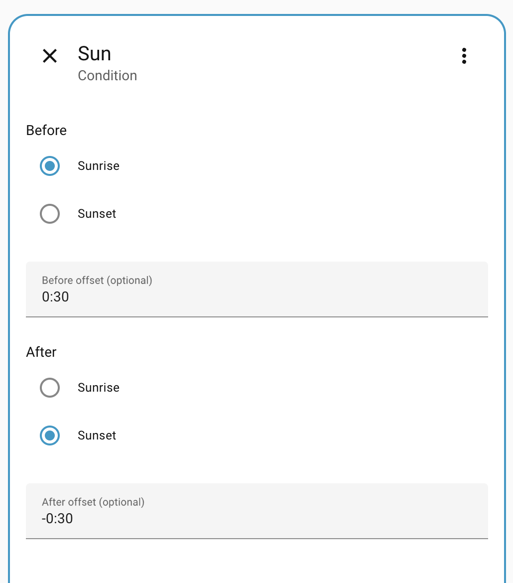 ** - I use a manual “house mode” that I set to “day” when I get up, since I don’t have a fixed schedule, but the effect is the same.