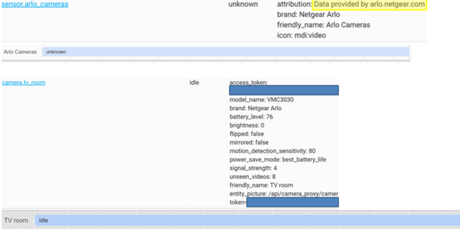 The arlo camera component (camera.tv_room) shows ‘idle’ . The sensor component that got auto-created (sensor.arlo_cameras) just shows ‘unknown’