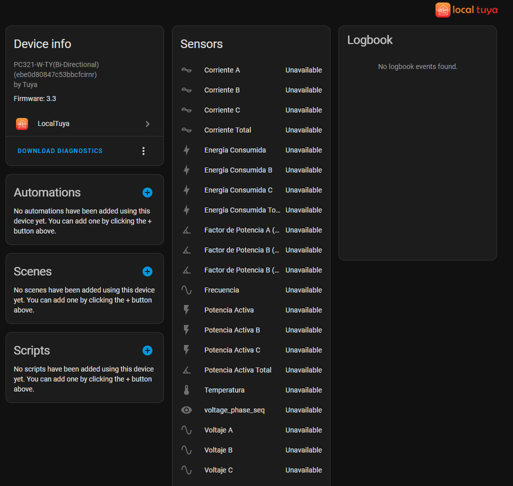 Thanks @Thierry34 - this table was really useful. I got the entities set up, although I couldnāt change the scaling apart from the voltages - so the numbers were factors out - and was making a final tweak - and it all stopped working with nothing being displayed. There was still one device showing in tuyalocal - but all the entities were not showing.