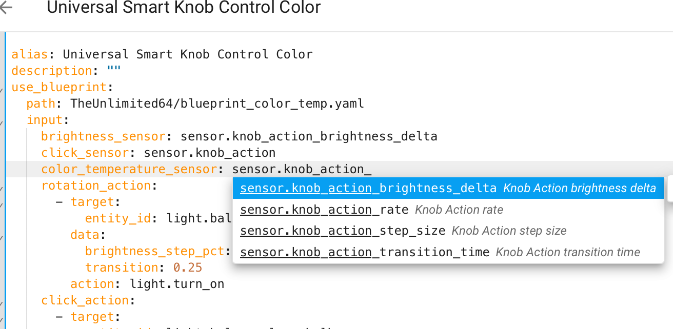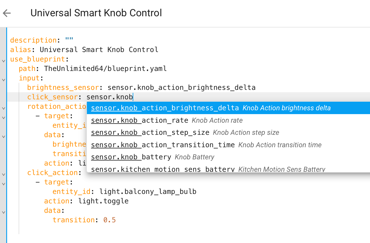 For anyone looking for help - once you got the knob configured as in the docs (still need the converter), use template from sophof post from above (Tuya smart knob improved blueprint for Zigbee2Mqtt - #13 by sophof), add it as a new template (Creating an automation blueprint - Home Assistant), reload your automations and create an automation with the blueprint via GUI - fill in all actions related to the knob itself and then just the click action and save. Then edit it with YAML to fill in the “custom” stuff and the rotations. Here’s my YAML of the automation: