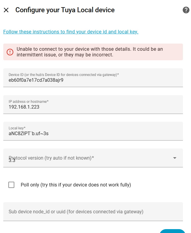 One thing I noticed is that the Device ID is different when using Cloud assisted device setup versus the Device ID found on the Tuya Developer Platform (I tried both). I couldn’t verify the Local key on the Tuya Platform, since they do not provide that information anymore to personal users. I found the correct IP address by looking at the device settings in the Smart Life app, getting the MAC address then going to my router to find the IP. There I noticed it is one of only two devices in my network that has lwip0 at the end of the IP. Could that mean something?