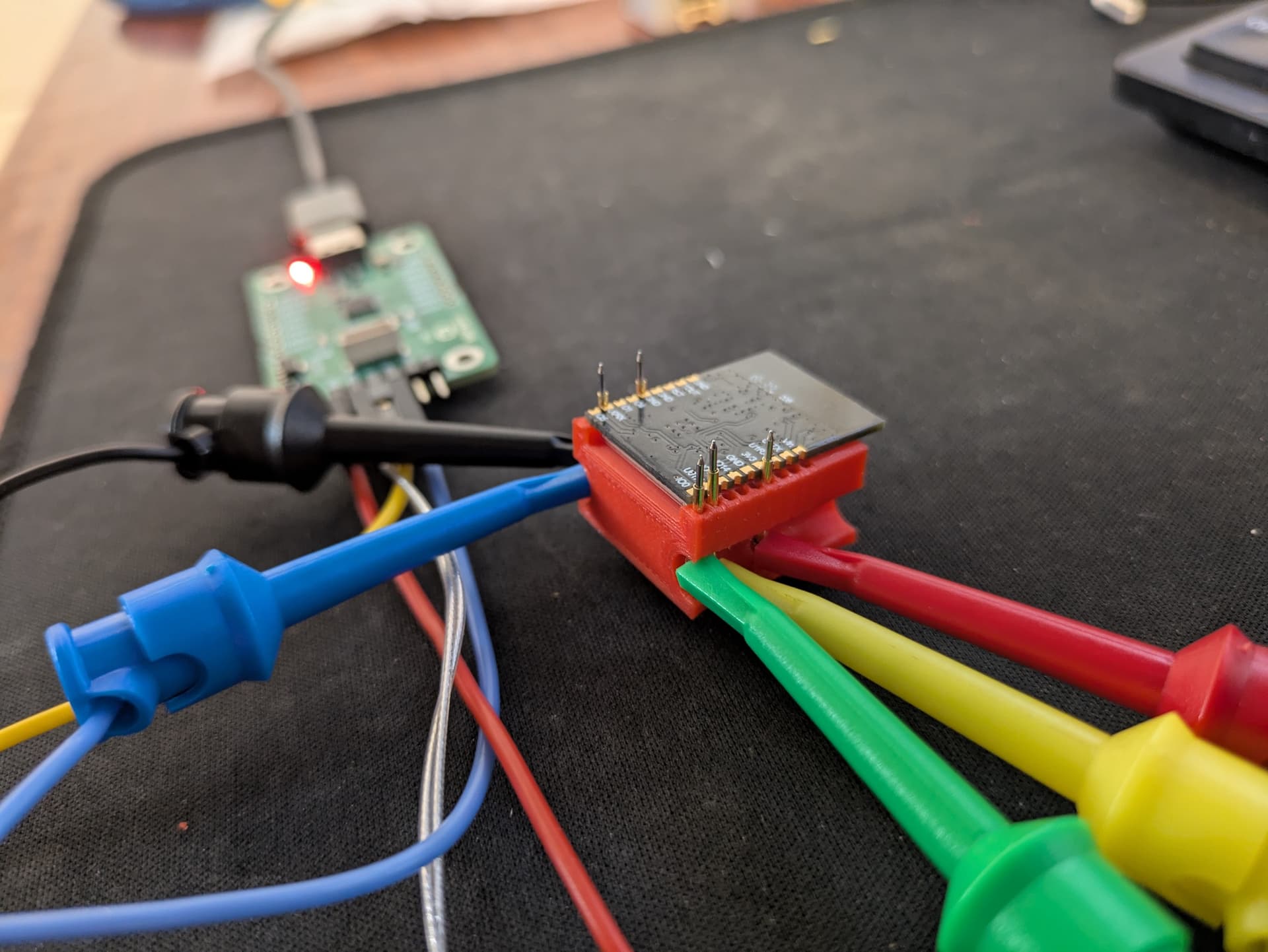 I then powered up the chip by connecting my serial programmer to my PC. I then used one of the ground cables to connect to IOO and then used the other ground gable to connect to reset. All you need to do is just touch the points and hold them. I then let go of reset and clicked tasmotize but kept the wire touching IOO. After I saw the transfer start, I took the cable away from IOO.