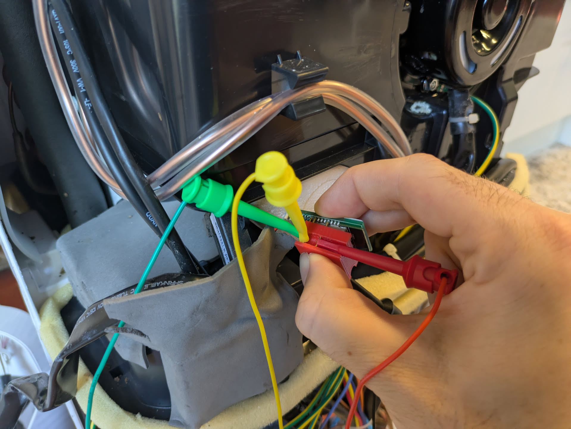 The chip in the motor is a TYWE1S but it also had headers on it. So I plugged it into a breadboard and powered it that way and also grounded it. That way I only had to stick TX and RX wires to the chip. Just to clarify, you can use those headers to power the board and by extension, it also powers the chip.