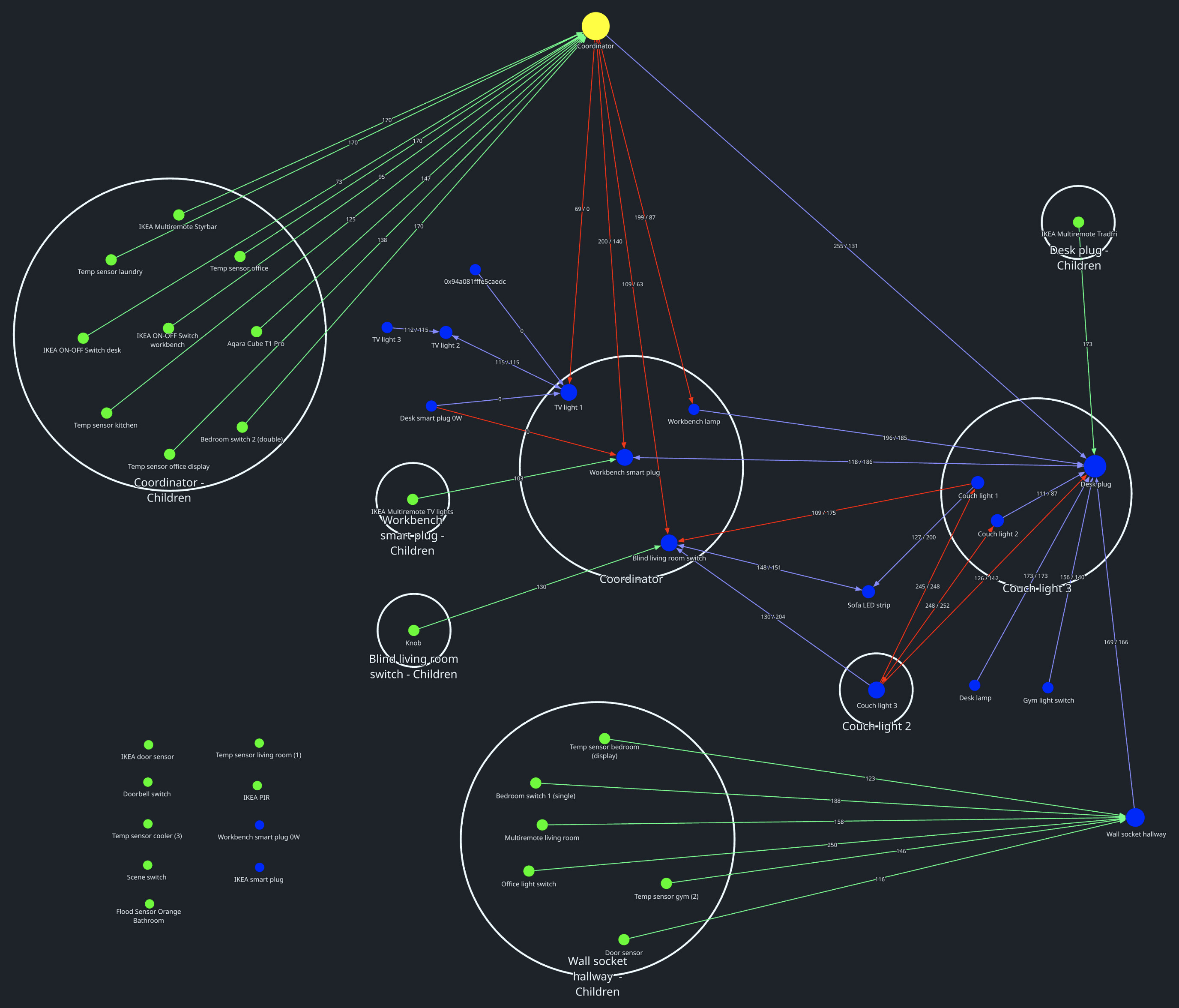 I face the similar issue. From the legend, red arrow indicates “Parent” relationship and Blue Dot represents router, but the label states coordinator and I’m wondering if it is normal.