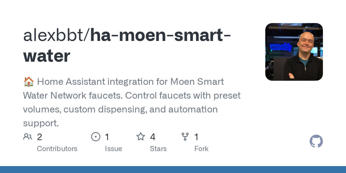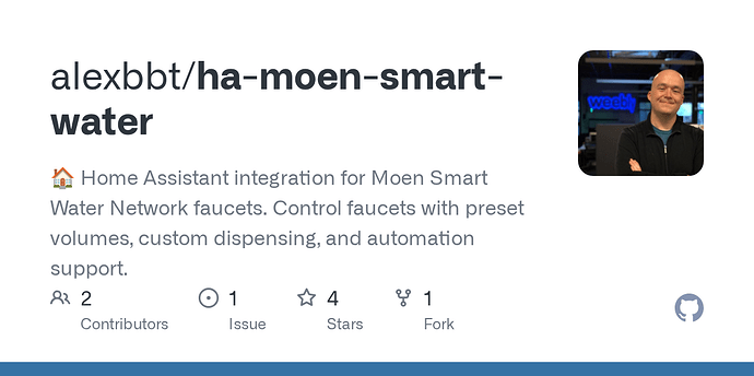 The integration is cloud-based (polling Moen’s API) and unofficial, but it exposes the faucet as Home Assistant entities and services, including valve control, flow rate, temperature presets, volume dispensing, and sensors.