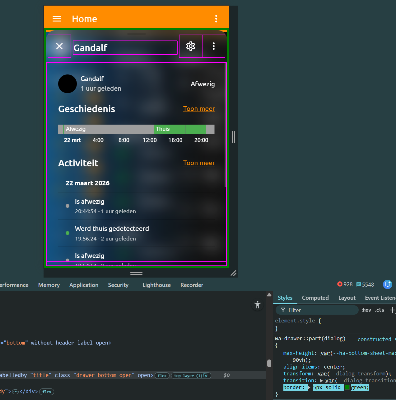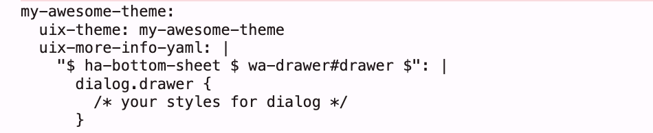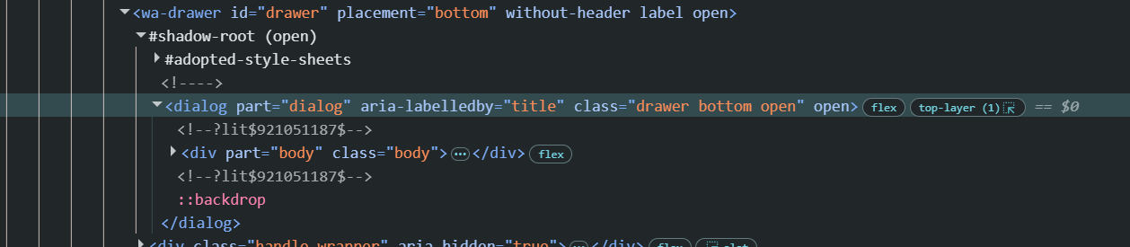 Also when i remove :host { } right after "ha-bottom-sheet $ wa-drawer#drawer $": the rest(purple 1px border and dialog::before {ā¦}) after that isnt even applied at all?