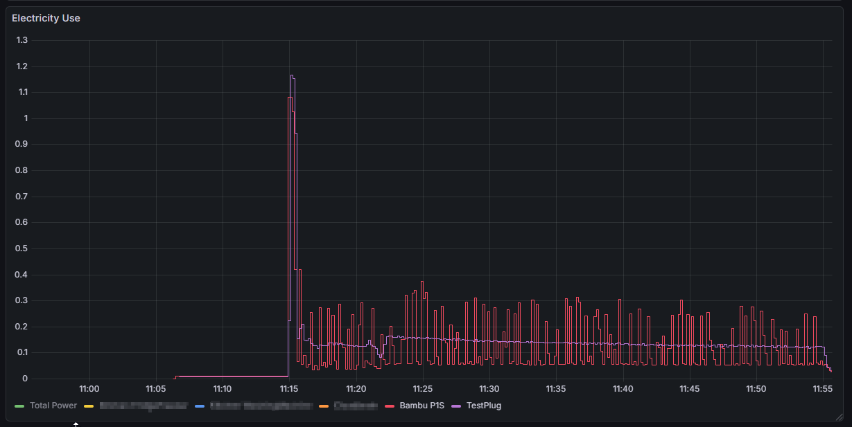 To test what I was seeing I also added a Tasmota power monitoring socket (from mylocalbytes.com) in series and recorded the power usage over the duration of a print. The results can be shown in the graph below.
