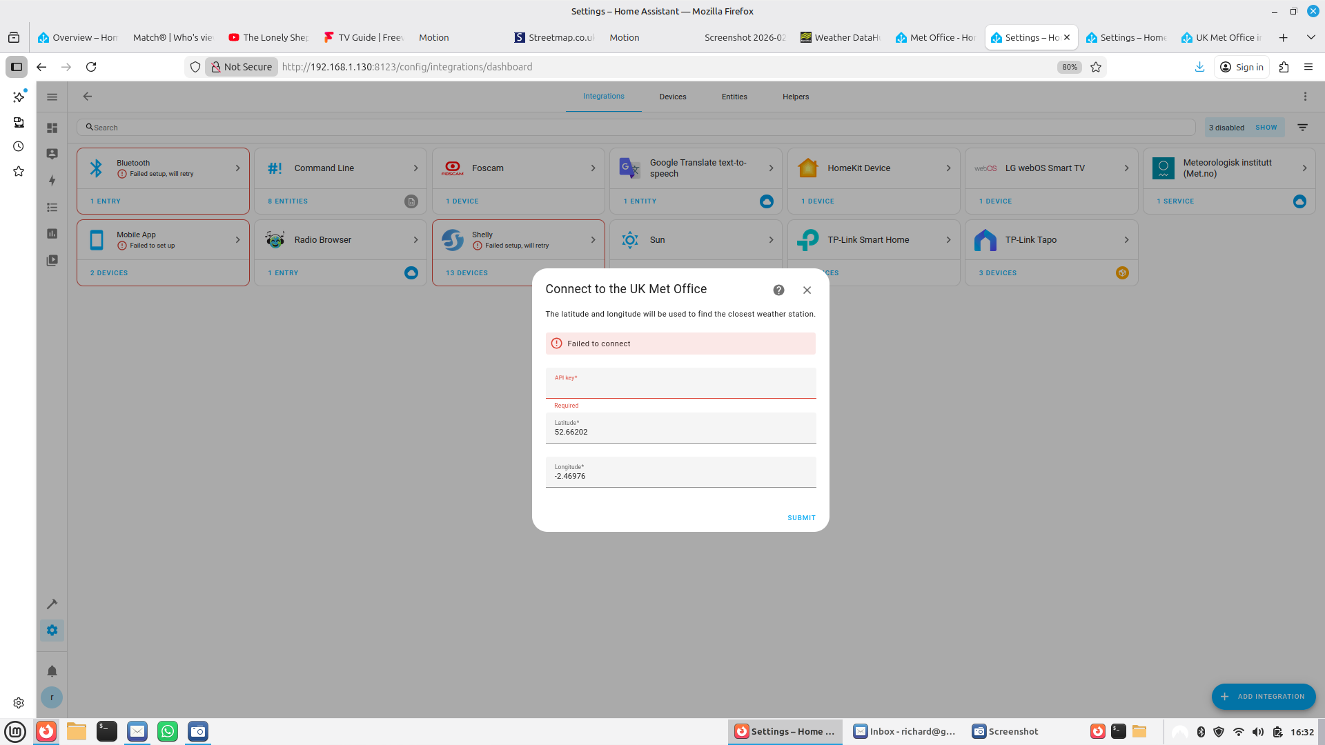 I case it was me screwing up the API key , I’ve reset it and tried again. I deleted the old Met office integration, I still get failed to connect on the integration set up.