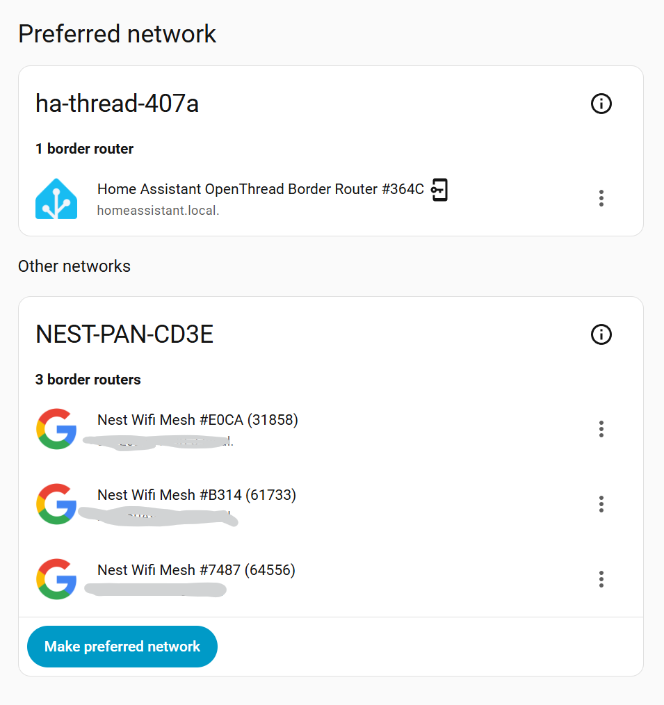 I started off using the Thread Network which Google Nest created, however after being plagued by network instability issues, I bought a HA ZTB-2 and I’m trying to create a network with only 1 border router as per this post