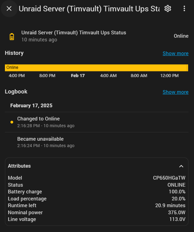From the integration, it seems like I should be able to see multiple stats (multiple entities?) for UPS stats, however I only see one single entity as shown below: