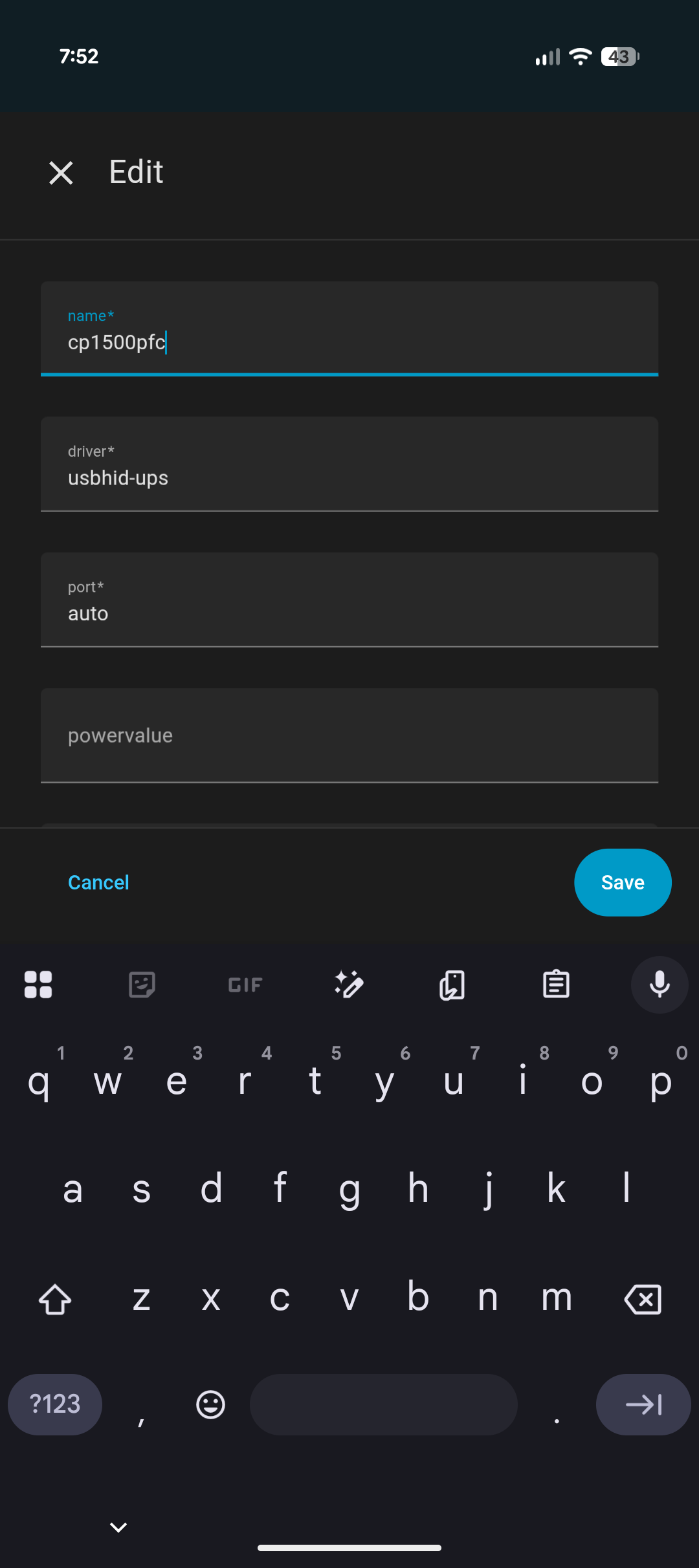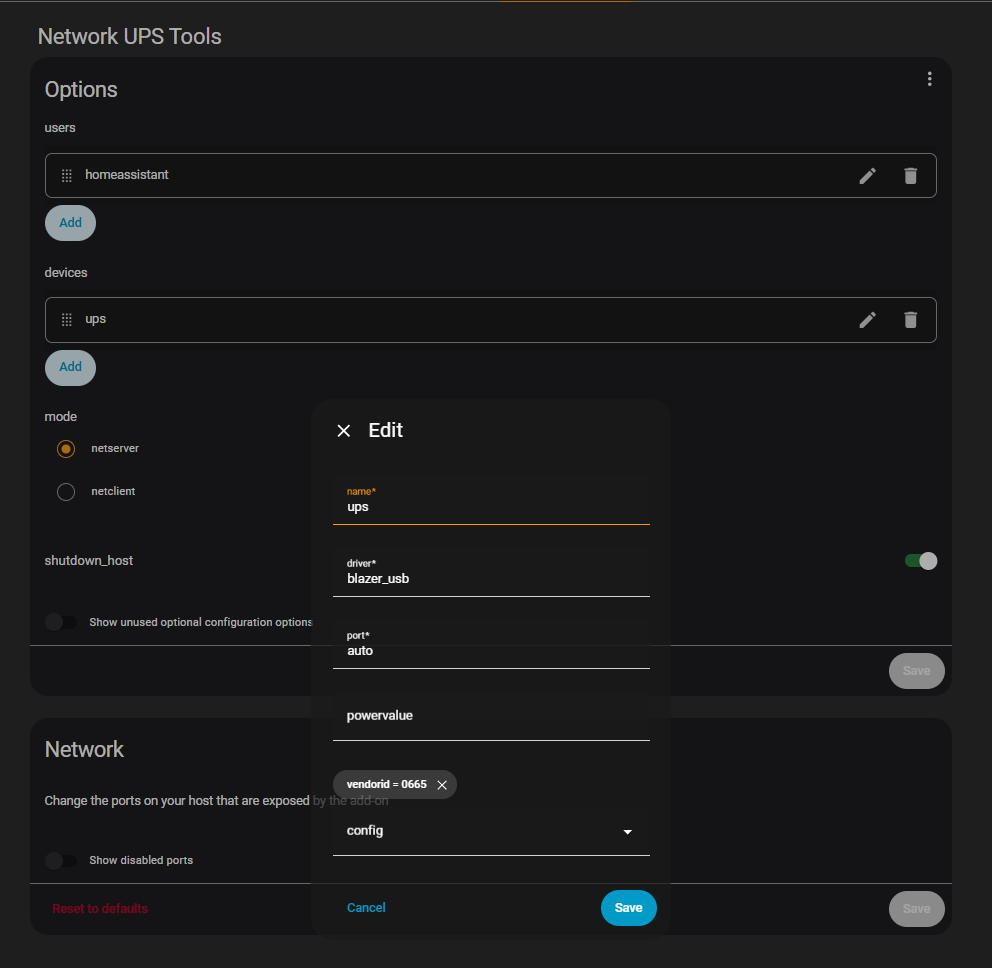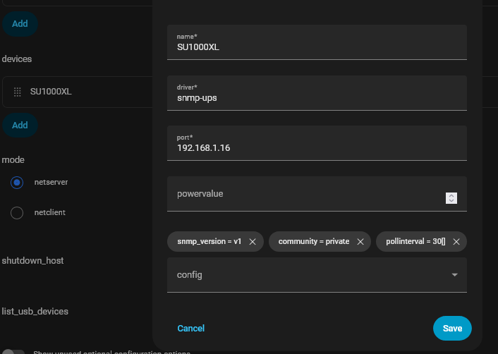 How do you have it connected to the network and home assistant? USB or network cable or WiFi? You use the USB if the UPS is connected to the Home Assistant Host via a USB cable. Use Network if network port is used.