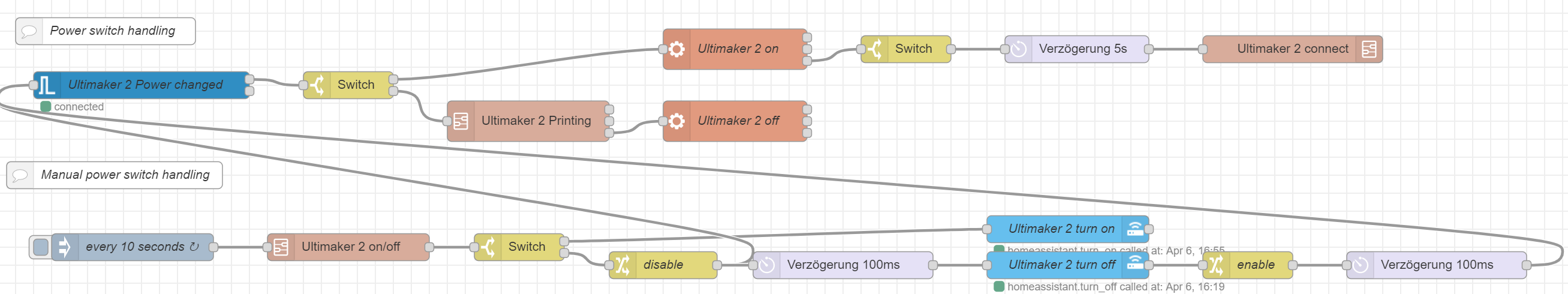 I created an input_boolean and NR monitors the state with a trigger-state node, if it goes ON then it uses SSH to send the signal to power on the plug and also if it goes off. I can monitor if the printer is on by listing the USB devices on the Raspi. That is done every 10 seconds and if I find the printer then I also want to set the state of the input_boolean because then I turned the printer manually on.