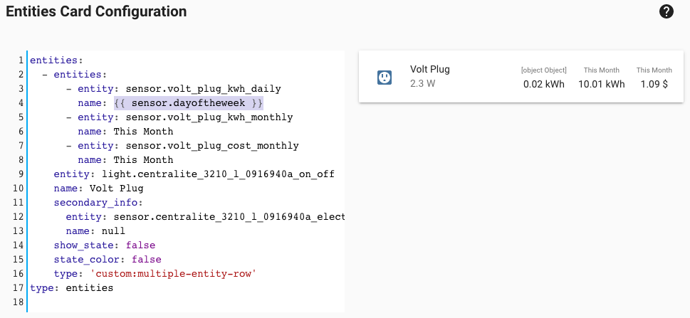 I would like to replace Today and Month with Thursday and May. I have the template sensors sensor.dayoftheweek and sensor.month set but I’ve been racking my brain trying to figure out how to use these in name: or friendly_name: fields.
