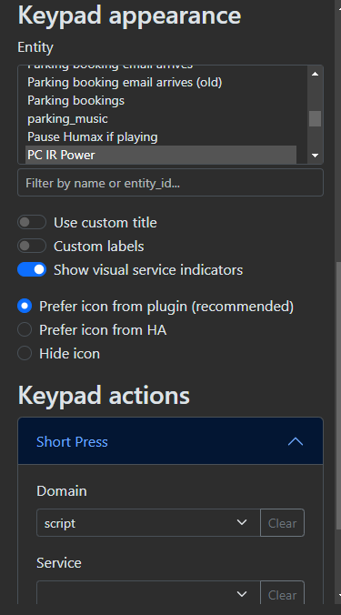 In the Keypad appearance section I have selected the script that I want to execute from the listbox (“PR IR Power”). In the Keypad actions section I have selected “script” from the Domain dropdown list. If I then select the Service dropdown list there are no entries. I then click Save configuration. When I press the button nothing happens.