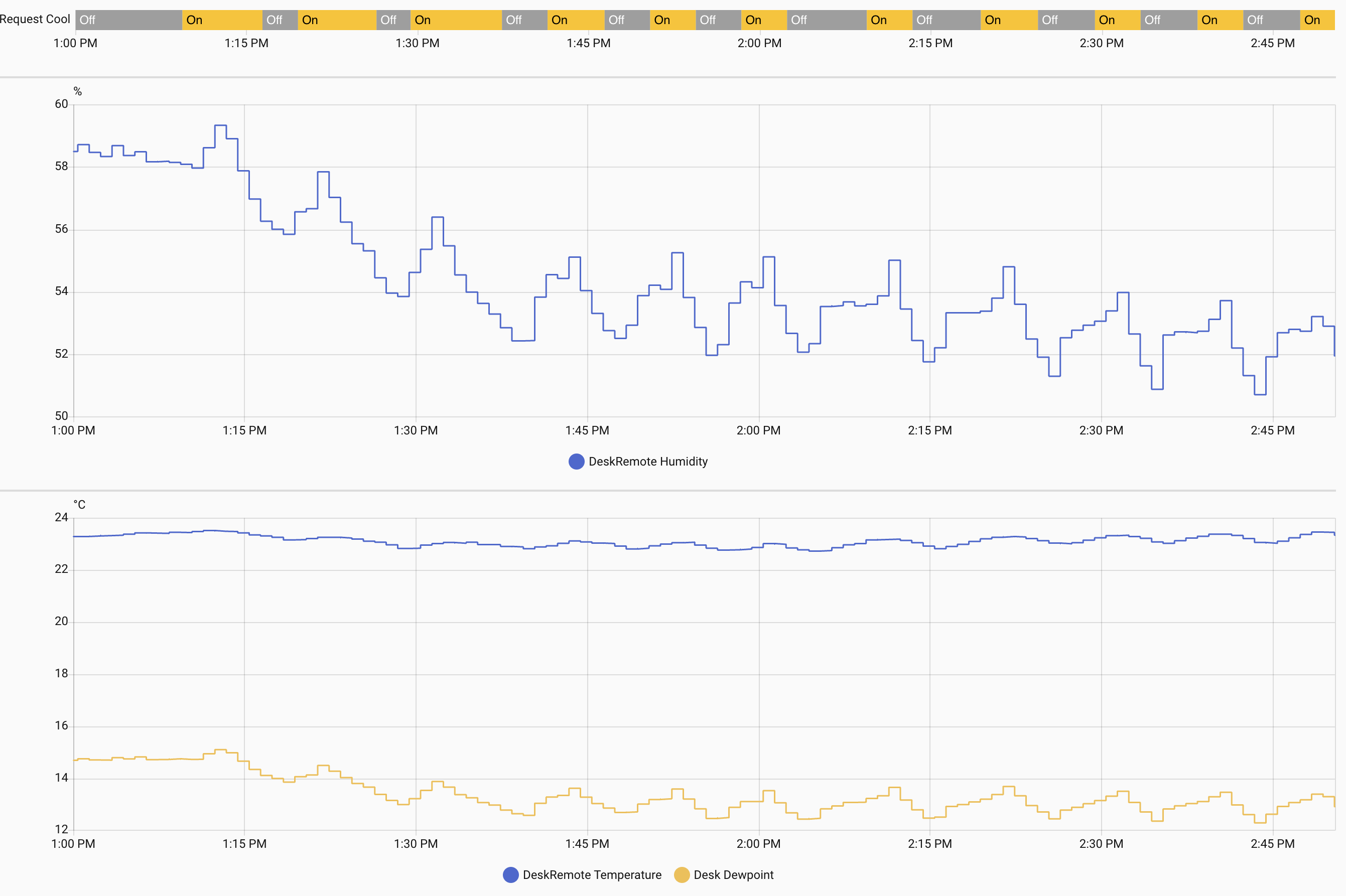 Humidity appears to be more of a trailing indicator than temperature - after the AC turns off the Humidity continues to drop and vice versa.