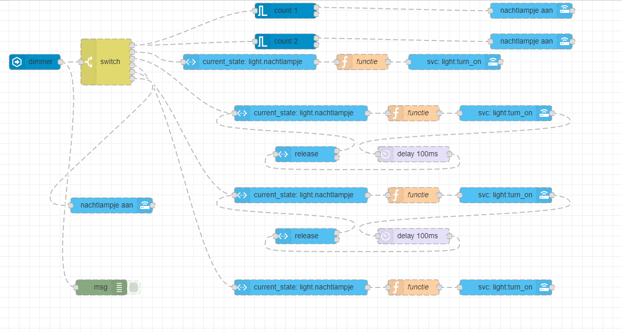 [{"id":"f5060296.38d55","type":"tab","label":"Slaapkamer redundant","disabled":false,"info":""},{"id":"feef0f5d.7aff5","type":"api-call-service","z":"f5060296.38d55","name":"nachtlampje aan","server":"ecc3b049.6889d","service_domain":"light","service":"turn_on","data":"{\"entity_id\":\"light.0x00158d0000cb52ce_light\",\"transition\":\"1.5\",\"brightness_pct\":\"5\"}","mergecontext":"","output_location":"","output_location_type":"none","x":1040,"y":20,"wires":[[]]},{"id":"52610c14.659794","type":"api-call-service","z":"f5060296.38d55","name":"nachtlampje aan","server":"ecc3b049.6889d","service_domain":"light","service":"turn_off","data":"{\"entity_id\":\"light.0x00158d0000cb52ce_light\",\"transition\":\"1.5\"}","mergecontext":"","output_location":"","output_location_type":"none","x":460,"y":660,"wires":[[]]},{"id":"ff6878a7.ccf2f8","type":"function","z":"f5060296.38d55","name":"functie","func":"newmsg = {};\n\n brightness = msg.data.attributes.brightness + 30;\n if (brightness < 30)\n { msg.payload = \"off\";}\n\n\nnewmsg.payload = { data: {\"brightness\":brightness} };\n\nreturn newmsg;","outputs":1,"noerr":0,"x":790,"y":120,"wires":[["a7bd50d6.1ea68"]]},{"id":"32367f3f.4c83e","type":"api-current-state","z":"f5060296.38d55","name":"","server":"ecc3b049.6889d","outputs":1,"halt_if":"","halt_if_type":"str","halt_if_compare":"is","override_topic":false,"entity_id":"light.0x00158d0000cb52ce_light","state_type":"str","state_location":"payload","override_payload":"msg","entity_location":"data","override_data":"msg","x":520,"y":120,"wires":[["ff6878a7.ccf2f8"]]},{"id":"a7bd50d6.1ea68","type":"api-call-service","z":"f5060296.38d55","name":"nachtlampje iets feller","server":"ecc3b049.6889d","version":"1","debugenabled":false,"service_domain":"light","service":"turn_on","entityId":"light.0x00158d0000cb52ce_light","data":"","dataType":"json","mergecontext":"","output_location":"","output_location_type":"none","mustacheAltTags":false,"x":1020,"y":120,"wires":[[]]},{"id":"88c7a23b.10c6d","type":"server-state-changed","z":"f5060296.38d55","name":"dimmer","server":"ecc3b049.6889d","entityidfilter":"sensor.0x0017880103c88525_action","entityidfiltertype":"exact","outputinitially":false,"state_type":"str","haltifstate":"","halt_if_type":"str","halt_if_compare":"is_not","outputs":1,"output_only_on_state_change":true,"x":70,"y":120,"wires":[["de103be2.f7ace8"]]},{"id":"de103be2.f7ace8","type":"switch","z":"f5060296.38d55","name":"","property":"payload","propertyType":"msg","rules":[{"t":"eq","v":"on-press","vt":"str"},{"t":"eq","v":"up-press","vt":"str"},{"t":"eq","v":"up-hold","vt":"str"},{"t":"eq","v":"down-press","vt":"str"},{"t":"eq","v":"down-hold","vt":"str"},{"t":"eq","v":"off-press","vt":"str"}],"checkall":"true","repair":false,"outputs":6,"x":210,"y":120,"wires":[["62146de.a637b94","5b75ea0.566eb18"],["32367f3f.4c83e"],["b16ffc92.8a05f"],["f4c0afab.bad2a"],["2e15335e.745edc"],["52610c14.659794"]]},{"id":"ff074d53.a2f85","type":"function","z":"f5060296.38d55","name":"functie","func":"newmsg = {};\n\n brightness = msg.data.attributes.brightness - 30;\n if (brightness < 30)\n { msg.payload = \"off\";}\n\n\nnewmsg.payload = { data: {\"brightness\":brightness} };\n\nreturn newmsg;","outputs":1,"noerr":0,"x":850,"y":560,"wires":[["872d8d1a.4da6e"]]},{"id":"f4c0afab.bad2a","type":"api-current-state","z":"f5060296.38d55","name":"","server":"ecc3b049.6889d","outputs":1,"halt_if":"","halt_if_type":"str","halt_if_compare":"is","override_topic":false,"entity_id":"light.0x00158d0000cb52ce_light","state_type":"str","state_location":"payload","override_payload":"msg","entity_location":"data","override_data":"msg","x":590,"y":560,"wires":[["ff074d53.a2f85"]]},{"id":"872d8d1a.4da6e","type":"api-call-service","z":"f5060296.38d55","name":"nachtlampje iets minder fel","server":"ecc3b049.6889d","version":"1","debugenabled":false,"service_domain":"light","service":"turn_on","entityId":"light.0x00158d0000cb52ce_light","data":"","dataType":"json","mergecontext":"","output_location":"","output_location_type":"none","mustacheAltTags":false,"x":1080,"y":560,"wires":[[]]},{"id":"7f845019.5312a","type":"function","z":"f5060296.38d55","name":"functie","func":"newmsg = {};\n\n brightness = msg.data.attributes.brightness + 30;\n if (brightness < 30)\n { msg.payload = \"off\";}\n\n\nnewmsg.payload = { data: {\"transition\":\"0.5\",\"brightness\":brightness} };\n\nreturn newmsg;","outputs":1,"noerr":0,"x":810,"y":220,"wires":[["3d5d0710.302888"]]},{"id":"b16ffc92.8a05f","type":"api-current-state","z":"f5060296.38d55","name":"","server":"ecc3b049.6889d","outputs":1,"halt_if":"","halt_if_type":"str","halt_if_compare":"is","override_topic":false,"entity_id":"light.0x00158d0000cb52ce_light","state_type":"str","state_location":"payload","override_payload":"msg","entity_location":"data","override_data":"msg","x":590,"y":220,"wires":[["7f845019.5312a"]]},{"id":"3d5d0710.302888","type":"api-call-service","z":"f5060296.38d55","name":"nachtlampje feller","server":"ecc3b049.6889d","version":"1","debugenabled":false,"service_domain":"light","service":"turn_on","entityId":"light.0x00158d0000cb52ce_light","data":"","dataType":"json","mergecontext":"","output_location":"","output_location_type":"none","mustacheAltTags":false,"x":990,"y":220,"wires":[["310c6290.16a62e"]]},{"id":"4bf28790.348178","type":"api-current-state","z":"f5060296.38d55","name":"release","server":"ecc3b049.6889d","outputs":2,"halt_if":"up-hold","halt_if_type":"str","halt_if_compare":"is_not","override_topic":false,"entity_id":"sensor.0x0017880103c88525_action","state_type":"str","state_location":"payload","override_payload":"msg","entity_location":"data","override_data":"msg","x":600,"y":300,"wires":[["b16ffc92.8a05f"],[]]},{"id":"310c6290.16a62e","type":"delay","z":"f5060296.38d55","name":"","pauseType":"delay","timeout":"500","timeoutUnits":"milliseconds","rate":"1","nbRateUnits":"1","rateUnits":"second","randomFirst":"1","randomLast":"5","randomUnits":"seconds","drop":fals