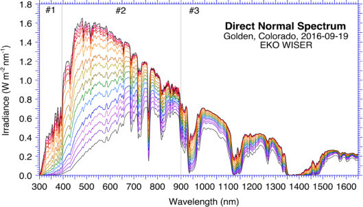 Commonly used solar panels absorb about 300nm-1um spectrum. My point was not the angle of the sun related to the panel, but the wavelength of irradiance when sun is low (warm white) That’s dominant at the morning and evening.
